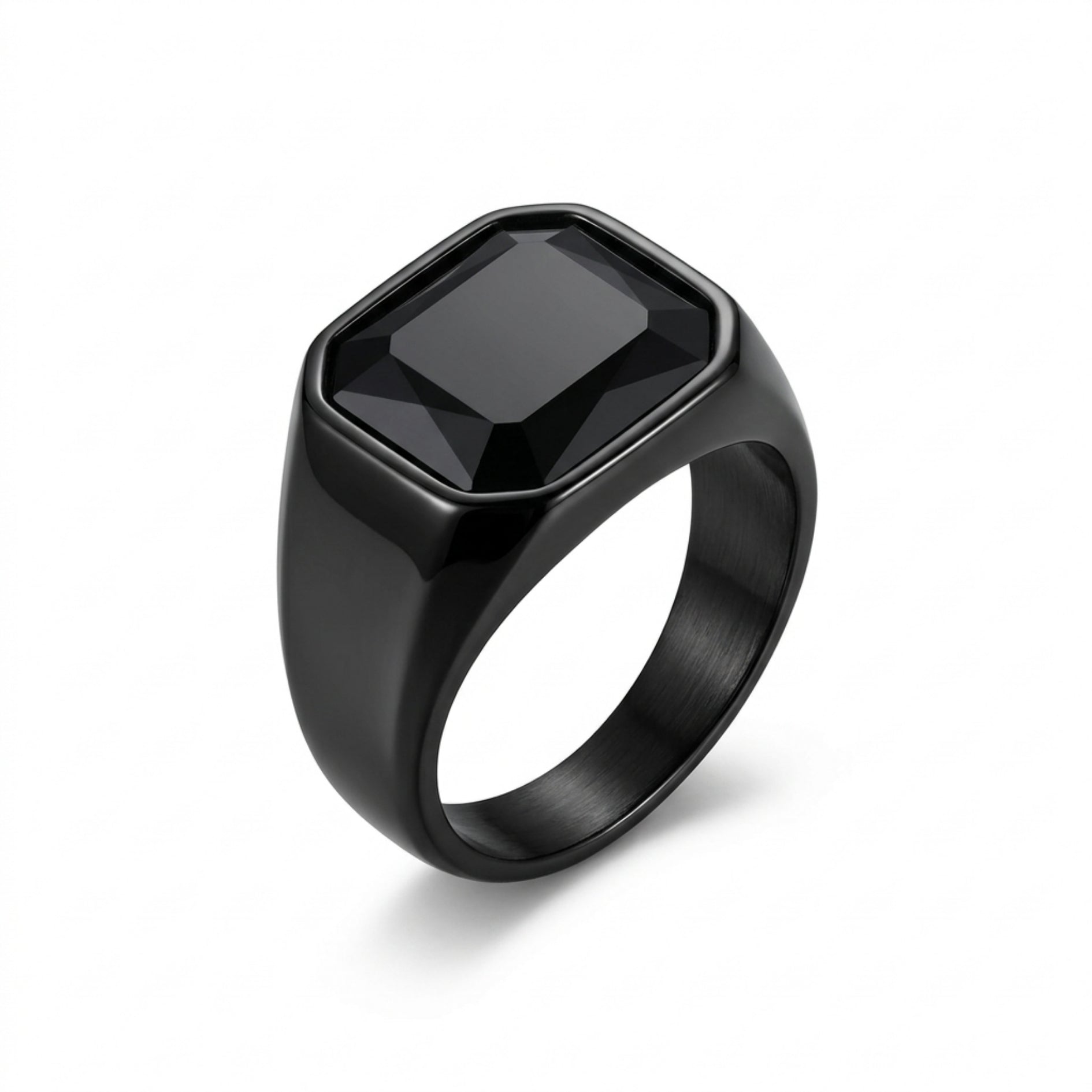 Bold men’s signet ring featuring a square-cut black stone with a sleek black ion-plated finish. Perfect for a strong, modern look.