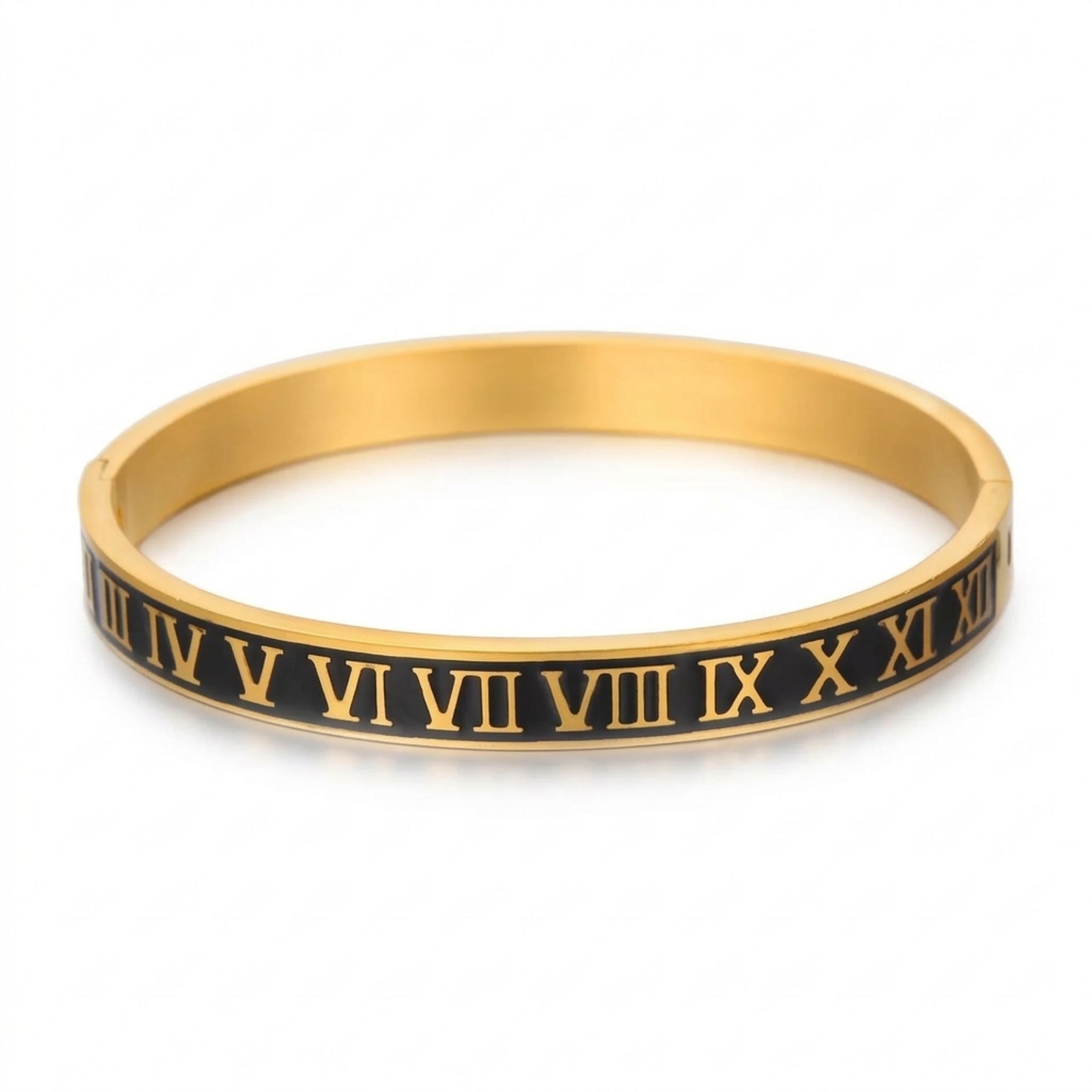 Elegant Roman numeral bangle bracelet featuring a gold-toned finish with a sleek black enamel inlay. Designed with a timeless aesthetic, this piece symbolizes eternity, balance, and everlasting style, making it perfect for both everyday wear and special occasions.